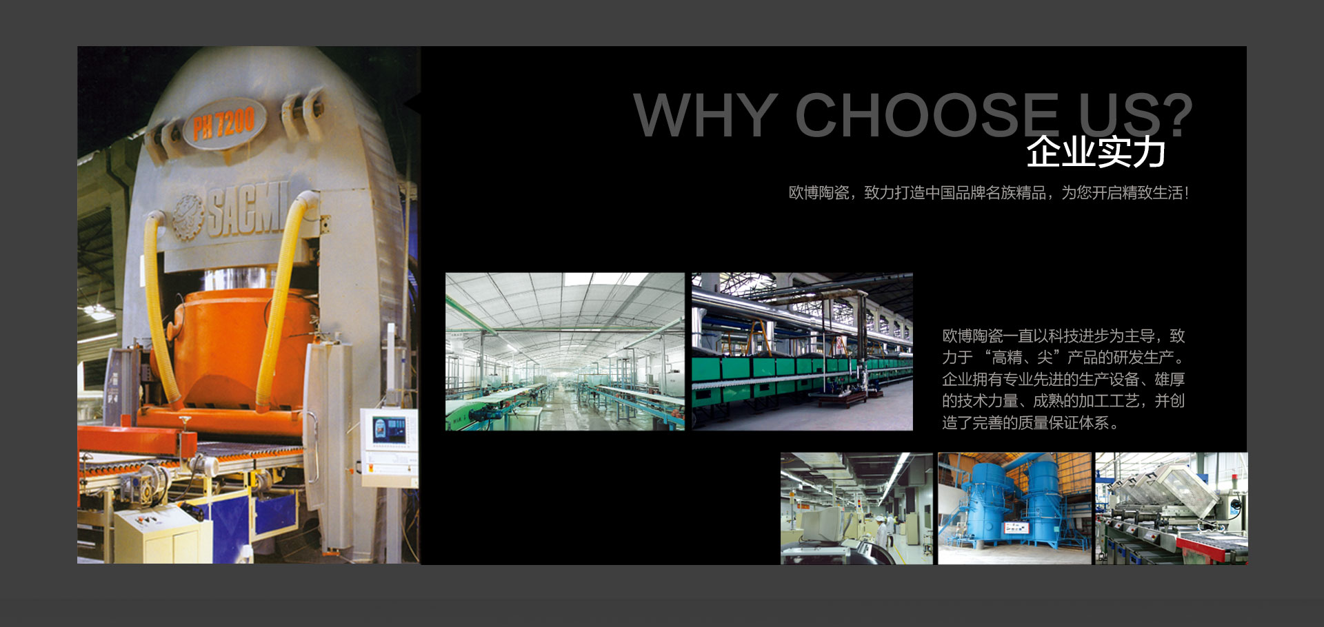 佛山市欧博瓷业有限公司创立于2003年,有着20年专注瓷砖生产历史。总部位于中国陶都 ----- 广东省佛山市南庄紫洞工业开发区。公司有着多年技术开发,资讯交流等经验,为欧博企业提供了优秀的起点平台。 欧博陶瓷在规模量化的基础上,严格遵循 ISO9001 : 2015 国际质量体系管理,产品各项物理指标均达到国家及国际相关标准,符合 GB/T4100-2015 标准和 GB6566-2010 《建筑材料放射性核素限量》标准 A 类装饰材料要求。 公司具有7条智能自动化生产线。专业生产 400*800mm 、 800*800mm 、600*1200mm 、 750*1500mm、900*1800mm 等标准规格产品,产品涵盖抛光砖、通体中板、柔光大理石、无界耐磨石、天鹅绒质感系列、岩板大板等系列产品,并可依据客户实际需求定制,能为各类工程项目、专业设计师以及普通家庭用户,提供丰富选择。 超越首先源于自身的提高,欧博陶瓷所推崇的发展之道,是致力于创新与人本的进步哲学,共赢是我们公共的追求!